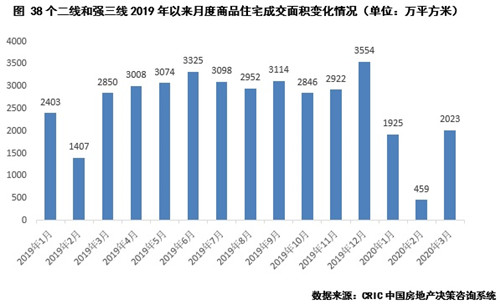回顧38個二線和強三線城市2019年至今的成交表現(xiàn),2019年整體保持穩(wěn)定,刨除1-2月因傳統(tǒng)春節(jié)假期對成交的影響之外,其余月份成交面積均維持在3000萬平方米上下波動,2019年12月創(chuàng)階段性新高達3554萬平方米,而后因遭遇新冠疫情,樓市急轉(zhuǎn)而下,2月幾近“冰點”,3月穩(wěn)步回升至2023萬平方米。