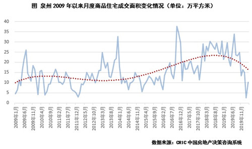 最后一類為重慶和泉州,因這兩個城市2015年以來沒有顯著的上下行周期,因而我們將時間軸延展到了2019年至今,總體來看,其目前處于下行周期的特征還是比較顯著的,這兩個城市的月度成交量基本都在2018-2019年迎來了顯著高點,而后開啟了穩(wěn)步回落。預(yù)判其2020年二季度走勢,我們認為,這樣的下行趨勢還將延續(xù),成交量預(yù)期穩(wěn)步回落,整體維持在歷史低位。