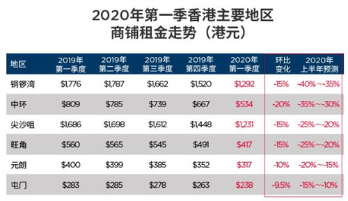 中環(huán)、銅鑼灣、尖沙咀及旺角的租金環(huán)比下跌15-20%不等,非核心區(qū)如屯門(mén)及元朗的租金則環(huán)比下跌10%。各核心區(qū)的商鋪空置率均有上升,旺角升幅最高,較上季增加7.3個(gè)百分點(diǎn)至20%,亦是過(guò)去十年的最高水平。