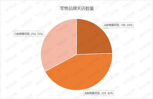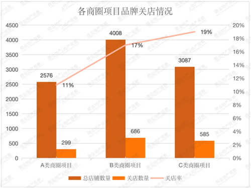 其中A類商圈購物中心平均關店數(shù)量為33家,關店率為11%,略高于近年同期數(shù)據(jù),但遠遠低于B類商圈C類商圈購物中心的關店率,值得注意的是,C類商圈項目關店率出現(xiàn)兩級分化現(xiàn)象,有4家項目關店率低于8%,但也有3家項目關店率高于31%。