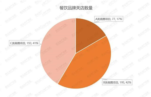 這20家商場按商圈分布進行分析,多處在B類和C類商圈內(nèi),其中C類商圈的項目有9家,而A類商圈較少,從側面可以反映出A類商圈運營的穩(wěn)定程度與抗風險能力,但整體來看餐飲業(yè)態(tài)受沖擊較大,與其他業(yè)態(tài)相對比尤為明顯。