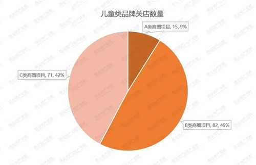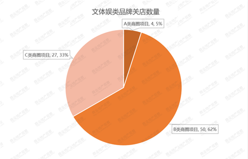 按商圈分布分析,A類商圈內(nèi)商業(yè)項目表現(xiàn)一直穩(wěn)定,9個商業(yè)項目中兒童業(yè)態(tài)的關店數(shù)量共15家,占比極低;B類和C類商圈內(nèi)商業(yè)項目兒童業(yè)態(tài)關店數(shù)量基本持平,分別為82家和71家,單個項目最多關店數(shù)量不超過20家,該業(yè)態(tài)關店情況平均占比在10%左右。文體娛業(yè)態(tài)關店總數(shù)為81家,其中A類商圈僅4家,B類50家,C類27家,遠低于零售、餐飲等業(yè)態(tài)。