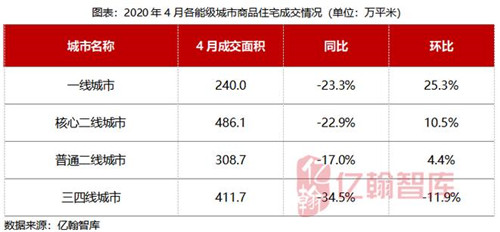 一線城市同比下降23.3%,降幅較3月收窄,環(huán)比上漲25.3%。核心二線和普通二線城市整體環(huán)比正增長,各城市表現(xiàn)不一。核心二線城市成交面積486.1萬平米,同比下跌22.9%,環(huán)比上漲10.5%。普通二線城市成交面積同比下降17.0%,降幅收窄7.2個百分點,環(huán)比上漲4.4%。三四線城市4月份成交面積同比下降34.5%,環(huán)比下降11.9%。