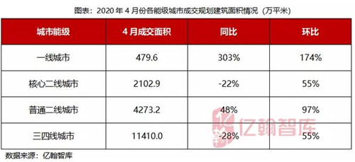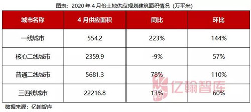 具體來看,2020年1-4月一線城市拿地面積占比為7%,較2019年同期下降1個百分點;核心二線城市拿地面積占比22%,較2019年同期大幅增加5個百分點;普通二線城市和三四線城市的拿地面積占比均有所下降,分別為31%、40%。