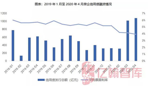 融資方面,2020年4月,房企信用債融資規(guī)模1081.92億元,環(huán)比增長6.4%,同比增加74.9%。4月房企境內(nèi)融資活動仍然積極,但信用債平均票面利率為3.91%,環(huán)比比下降0.22個百分點,發(fā)債成本持續(xù)下降。