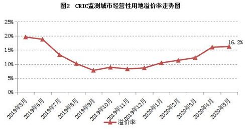2020年5月,在推進(jìn)生產(chǎn)要素市場化的大環(huán)境下,土地市場交易景氣持續(xù)回升,成交面積創(chuàng)下年內(nèi)新高,溢價(jià)率也在上月上升的基礎(chǔ)上再漲0.2個(gè)百分點(diǎn),實(shí)現(xiàn)2020年來的5連漲,市場熱度持續(xù)上升。