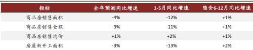 銷售金額角度,綜合上述判斷我們預(yù)計(jì)全年商品房銷售額同比下降3%(1-5月-11%,隱含6-12月+1%)。
