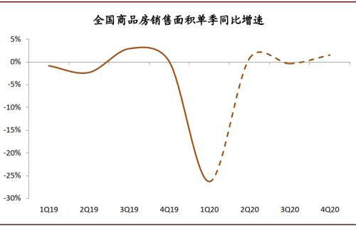 銷售面積下半年整體延續(xù)漲勢,但節(jié)奏回歸季節(jié)性,預(yù)計(jì)全年同比下跌4%。4月以來伴隨國內(nèi)疫情得到有效控制,行業(yè)復(fù)工復(fù)產(chǎn)帶動(dòng)銷售數(shù)字快速回升,5月統(tǒng)計(jì)局銷售數(shù)據(jù)同比轉(zhuǎn)正(銷售面積/銷售金額分別同比+9.7%/+14%)、6月高頻行業(yè)數(shù)字亦顯示銷售延續(xù)升溫勢頭,二季度我們判斷全國商品房銷售面積將由一季度-26.3%的同比下跌轉(zhuǎn)為低個(gè)位數(shù)增長。往下半年看,我們判斷基本面將由前期復(fù)工復(fù)產(chǎn)帶動(dòng)的快速修復(fù)回歸至正常季節(jié)性波動(dòng),預(yù)計(jì)三季度銷售同比增速將較二季度有所回落,而四季度可能再次邊際回升,全年預(yù)計(jì)商品房銷售面積同比跌幅將收窄至4%(1-5月-12%,隱含6-12月同比增長1%)。