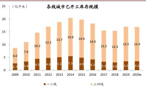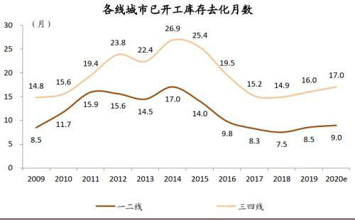新開工平穩(wěn)修復(fù),預(yù)計(jì)全年新開工面積跌幅將收窄至3%。當(dāng)前一二線城市已開工未售庫存雖有小幅上修,但去化月數(shù)仍處于低位(我們預(yù)計(jì)2020年末升至9個(gè)月),三四線庫存雖有上升但也不高(我們預(yù)計(jì)2020年末升至17個(gè)月),該庫存水平下房企仍存在開工補(bǔ)庫需求,我們認(rèn)為下半年新開工將整體延續(xù)增長。節(jié)奏上,我們判斷新開工與銷售趨勢類似,同樣將由前期快速反彈逐漸回歸季節(jié)性波動(dòng),預(yù)計(jì)全年新開工面積跌幅將收窄至3%(1-5月-13%,隱含6-12月+2%)。
