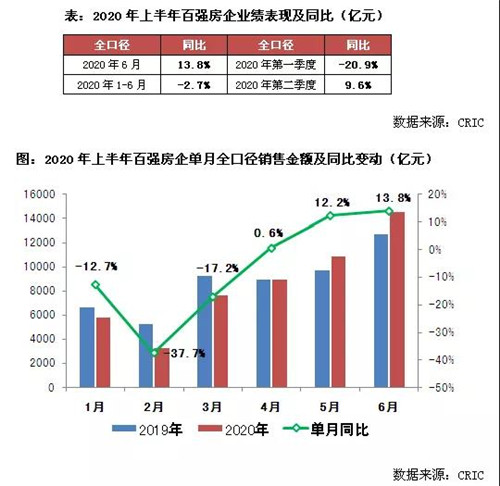 2020年6月,市場(chǎng)熱度持續(xù)、房企去化加速,TOP100房企單月實(shí)現(xiàn)全口徑銷售金額14517.2億元,環(huán)比增長(zhǎng)33%。單月業(yè)績(jī)同比逐月回升,自4月轉(zhuǎn)正后進(jìn)一步提升至13.8%。