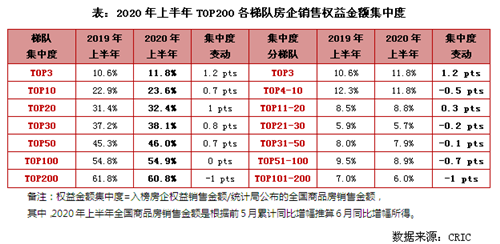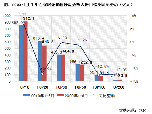 一方面,2020年上半年,TOP10房企銷售操盤金額入榜門檻增加7.1%至912.1億元。而除TOP10房企外,截至6月末百?gòu)?qiáng)房企各梯隊(duì)銷售金額入榜門檻仍同比降低。