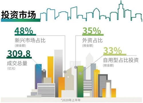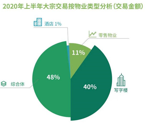 2020年第二季度,北京達(dá)成九筆大宗交易 ,但有五宗在10億元人民幣以下,交易總額僅達(dá)108.3億元人民幣,環(huán)比下降46%;上半年大宗交易總額為309.8億元,同比下降24%。因疫情而造成的交易延滯使得境外投資者本季度未能延續(xù)往期的活躍態(tài)勢,僅達(dá)成一筆交易。境內(nèi)地產(chǎn)基金則成為最活躍買家,貢獻(xiàn)了本季度62%的交易額。自用買家依然保持旺盛的辦公置業(yè)需求,但市場上可售物業(yè)稀缺。本季豐臺和大興共錄得三筆寫字樓和商務(wù)園區(qū)的自用購置交易,標(biāo)的物業(yè)分別以片區(qū)同類物業(yè)單價紀(jì)錄成交。寫字樓依然為主要物業(yè)類型,占本季度總交易額度的78%,其中包括本季度金額最大的交易東方資產(chǎn)通過法拍收購中弘大廈。零售物業(yè)則貢獻(xiàn)剩余的22% ,其中一筆來自北投收購?fù)ㄖ菥┖紡V場,為上半年連續(xù)第二個季度錄得副中心的大宗成交。