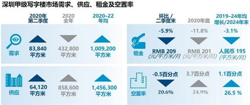 盡管經濟活動重啟,但是深圳甲級寫字樓租金仍然承壓下行,環(huán)比一季度下降5.9個百分點,業(yè)主則希望通過充滿吸引力的租金優(yōu)惠和更加靈活的租賃條款來獲取和留存租戶。