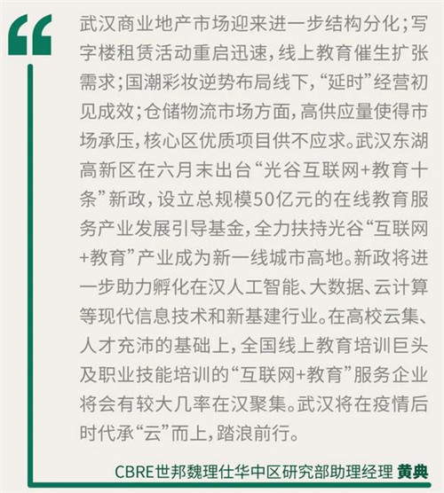 “展望未來六個月,由于復工復產(chǎn)的效率逐步提升,預計有近30萬平方米新增供應將在年末逐步交付使用。其中位于光谷中心城的國采中心將會在三季度入市。隨著產(chǎn)業(yè)扶持政策的陸續(xù)出臺,互聯(lián)網(wǎng)行業(yè)中線上教育會進一步擴張!