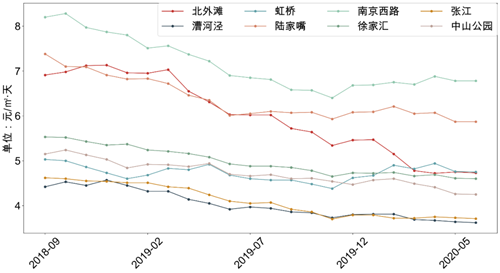 圖:2018年9月~2020年6月上海主要商圈甲乙級(jí)寫字樓租金走勢(shì)