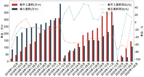 圖:2018年1月~2020年05月上海辦公樓新開工和竣工情況