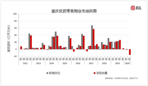 消費(fèi)市場(chǎng)受疫情沖擊承壓,零售商業(yè)租賃需求放緩,商業(yè)綜合體及零售物業(yè)在建項(xiàng)目施工與招商進(jìn)程受一定程度影響。上半年重慶主城區(qū)優(yōu)質(zhì)零售物業(yè)市場(chǎng)無新增供應(yīng),總存量維持693萬平方米。