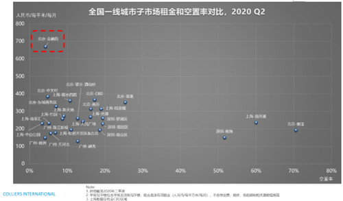 截止到2020年二季度,金融街甲級寫字樓平均租金達(dá)到670元每月每平米,環(huán)比下降-1.4%,同比下降4%;空置率依舊保持5%以下的水平,達(dá)到4.2%,環(huán)比上升0.6%,同比上升2.5%。 和甲級寫字樓市場類似,金融街的乙級寫字樓目前也保持非常低的空置率,僅為3.6%,租金維持在450元每月每平米左右。
