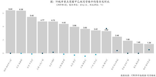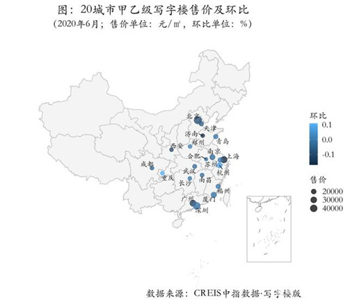 6月,20城市中七成區(qū)縣甲乙級(jí)寫字樓售價(jià)環(huán)比保持平穩(wěn),九成區(qū)縣的售價(jià)同比下降。