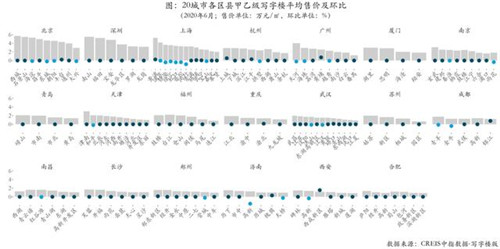 整體:2020年6月,20城市寫字樓售價(jià)整體水平環(huán)比微降,平均售價(jià)為21506.96元/㎡,平均同環(huán)比分別為和3.49%和-0.03%。