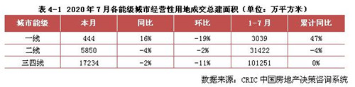 其中,一線增長(zhǎng)最為顯著,較2019年8月已增長(zhǎng)18%,整體庫(kù)存壓力依舊較大。究其原因,主要與疫情之后政府加緊供地導(dǎo)致土地成交量激增密切相關(guān)。據(jù)CRIC監(jiān)測(cè),2020年1-7月一線城市經(jīng)營(yíng)性用地成交總建面積達(dá)到了3039萬(wàn)平方米,同比上漲了47%,在不同能級(jí)城市中漲幅居首,這也直接導(dǎo)致了一線未開工地塊建面穩(wěn)步增加,預(yù)判下月,一線的廣義庫(kù)存量仍有望高位維持。