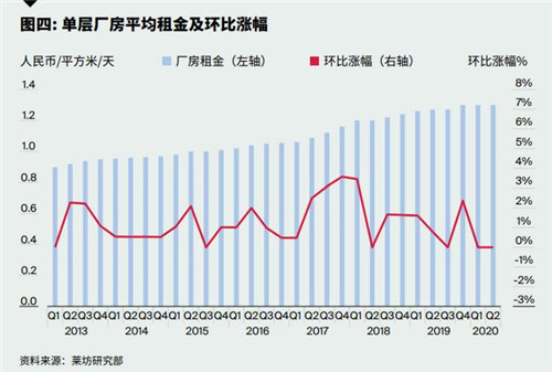 第二季度,上海工業(yè)園區(qū)廠房租金保持穩(wěn)定,單層廠房平均租金保持不變,維持在每天每平方米人民幣1.3元。