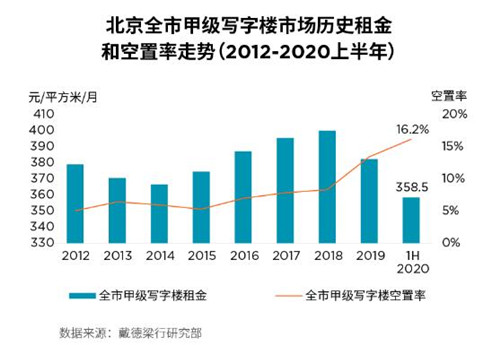 為盡快提高入駐率和最大限度減少自身損失,寫字樓業(yè)主紛紛為租戶提供更優(yōu)惠的租金和更大的免租力度,使2020年上半年北京全市寫字樓有效凈租金同比下降9.5%,達每月每平方米358.5元,創(chuàng)2012年以來新低。