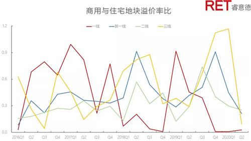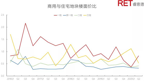 2020年第二季度,中國商用土地指數(shù)為82.4,環(huán)比上升19.4%,同比下降16.7%。一線城市商用土地交易情況較上一季度基本持平,受二三線城市商用土地交易情況影響,整體市場流拍問題好轉(zhuǎn),流拍數(shù)量環(huán)比下降7.3%,成交流拍比為37.0。全國商辦用地成交數(shù)量較上一季度明顯增長,商業(yè)用地占總土地交易量比例較第一季度沒有顯著變化。其中,三線城市商用土地市場成交流拍比由上一季度的65.0降至23.9。