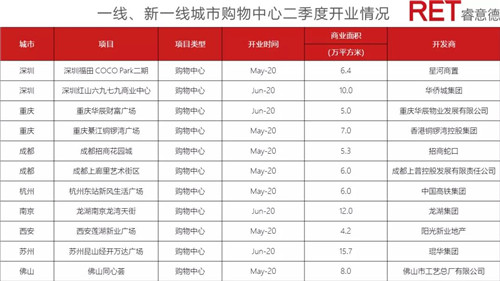 一線城市僅深圳有購物中心新項目開業(yè)。5月30日,福田星河COCO Park二期正式亮相,與一期僅隔一條馬路,位于星河國際首層,由原君尚百貨改造而來。項目打造了福田區(qū)最大的兒童體驗地“星趣小鎮(zhèn)”以及200平方米的無際空間藝術(shù)展覽館,入駐品牌有首進(jìn)華南的安莉芳新零售體驗店、麥當(dāng)勞未來智慧概念餐廳、sp@ce天虹超市、Twinkle耀童親子餐廳等。華僑城與招商蛇口聯(lián)合打造的紅山六九七九商業(yè)中心于6月底開業(yè),集公園式商業(yè)街區(qū)、體驗式公寓、時尚演藝劇場、人文藝術(shù)展覽館及城市精品酒店于一體,總建筑面積約34萬平方米,商業(yè)部分體量約10萬平方米,有華南首家自主運營開心麻花劇院、盒馬鮮生、CGV影院主力店等。