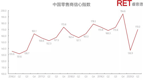 2020年第二季度,中國零售商信心指數(shù)為170.0,環(huán)比上漲24.2%,同比上漲1.0%。城鎮(zhèn)居民人均消費支出6,007億元,同比下降6.2%。監(jiān)測類限額以上企業(yè)商品零售類值同比下降23.1%,環(huán)比下降10.0%。第一季度受疫情影響,購物中心營業(yè)店鋪數(shù)量縮減,而二季度品牌商店鋪批量重開是零售商信心指數(shù)增長的原因之一。