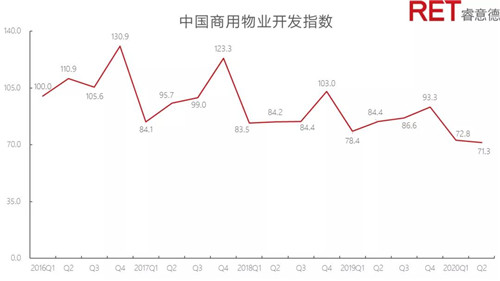 第二季度,中國商用物業(yè)開發(fā)指數(shù)為71.3,環(huán)比下降2.0%,同比下降15.5%,項目供應(yīng)數(shù)量環(huán)比下降6.4%,同比下降19.7%。新增商用物業(yè)面積環(huán)比上升0.1%,同比下降13.5%。商用物業(yè)市場自一季度受到疫情沖擊以來,持續(xù)低迷。
