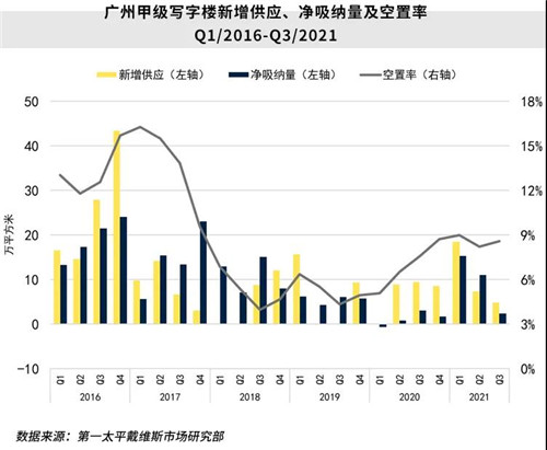 第三季度,受市場租賃需求有所放緩及新項目入駐率較低的雙重影響,全市空置率小幅上升。截至季末,廣州甲級寫字樓物業(yè)市場空置率環(huán)比上升0.4個百分點至8.6%。