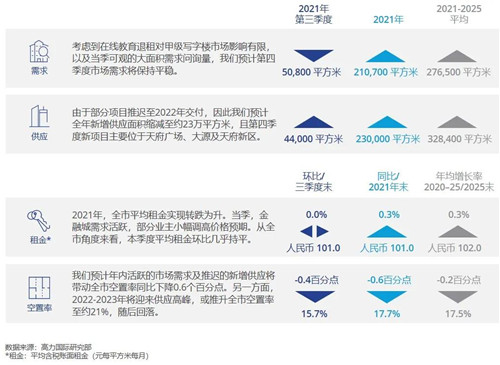 受“雙減”政策影響,高力預(yù)計年底至明年在線教育行業(yè)仍將處于調(diào)整轉(zhuǎn)型階段,因此市場仍存在一定退租風(fēng)險。不過,由于多數(shù)甲級寫字樓業(yè)主前期考慮到人員管理等因素,未對該類租戶大規(guī)模招商,因此全市甲級寫字樓市場內(nèi)總存量較小,后期影響有限。與此同時,考慮到當(dāng)季金融及能源等行業(yè)的大面積需求問詢量,高力對第四季度市場需求持樂觀態(tài)度。