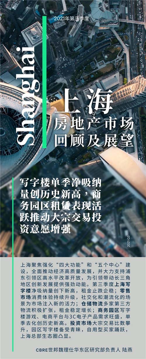2021年第三季度,上海商務(wù)園區(qū)寫字樓市場(chǎng)錄得兩個(gè)新增供應(yīng)交付,共計(jì)10.9萬平方米。租賃市場(chǎng)活躍度進(jìn)一步提升,單季凈吸納量達(dá)36.5萬平方米,推升年內(nèi)累計(jì)去化量?jī)H次于2015年峰值,整體市場(chǎng)空置率持續(xù)下行至14.2%,環(huán)比下降2.6個(gè)百分點(diǎn)。