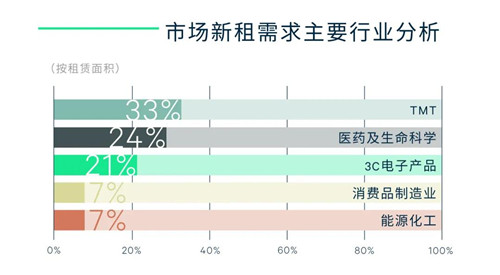 TMT (33%)、醫(yī)藥及生命科學(xué) (24%) 及3C電子產(chǎn)品 (21%) 為季內(nèi)租賃需求的主要來源?萍计髽I(yè)在商務(wù)園區(qū)各子板塊中多點(diǎn)開花,正值高速發(fā)展階段的游戲公司在漕河涇保持強(qiáng)勁擴(kuò)張態(tài)勢(shì),電商運(yùn)營與直播類租戶分別選址臨空與金橋板塊,云計(jì)算與區(qū)塊鏈企業(yè)分別在張江和市北錄得大面積成交;醫(yī)藥研發(fā)租戶選擇在張江板塊內(nèi)實(shí)現(xiàn)升級(jí)搬遷,而具備性價(jià)比優(yōu)勢(shì)的浦江與外高橋板塊亦吸引部分相關(guān)企業(yè);電子產(chǎn)品租戶中,半導(dǎo)體與手機(jī)類企業(yè)在張江與金橋完成擴(kuò)租。此外,新能源汽車為主導(dǎo)的消費(fèi)品制造業(yè)以及各類能源化工企業(yè)亦錄得新租或搬遷成交。擴(kuò)張與新設(shè)仍為本季度主要成交類型,持續(xù)釋放的旺盛需求致各板塊空置率呈現(xiàn)不同程度的下降。租金方面,區(qū)別于上半年張江與漕河涇領(lǐng)漲全市租金的情況,三季度各子市場(chǎng)租金水平均實(shí)現(xiàn)正增長,推動(dòng)全市平均租金報(bào)價(jià)與有效租金較上季分別上漲1.0%與1.3%。