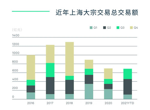 2021年第三季度,上海大宗交易市場(chǎng)繼續(xù)領(lǐng)跑全國,共錄得25筆交易,成交總額共計(jì)218.7億元。盡管單季金額環(huán)比下降,但年內(nèi)累計(jì)成交金額達(dá)678.0億元,已然接近去年全年交易水平,投資活躍度穩(wěn)中有升。