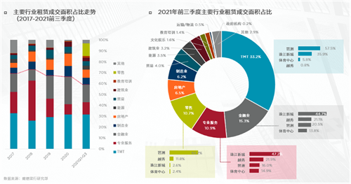 近期隨著圍繞教育的相關政策陸續(xù)發(fā)布,線上教育與游戲類企業(yè)對于擴張與置換物業(yè)表現(xiàn)謹慎。一些業(yè)主為了減少樓宇的空置時間,主動讓價以提升項目入駐率。專業(yè)服務、金融業(yè)、TMT仍然是需求主力。其中專業(yè)服務業(yè)成交占比居首,較上季度擴大5.5個百分點。以律所、保險為代表的細分行業(yè)租戶選擇搬遷至面積更大或品質更高的辦公空間,如盈科律師事務所租下周大福金融中心近4000平方米辦公室。另一方面,盡管TMT在三季度的成交占比有所下降,但擴張的需求仍然更多的來自于成長中的互聯(lián)網(wǎng)與科技類企業(yè)。例如快手租下廣電平云廣場5000平方米辦公室用于擴租。