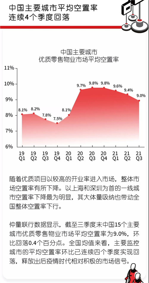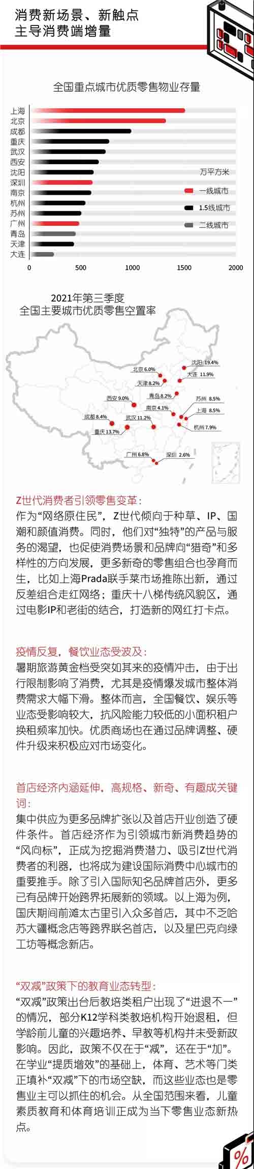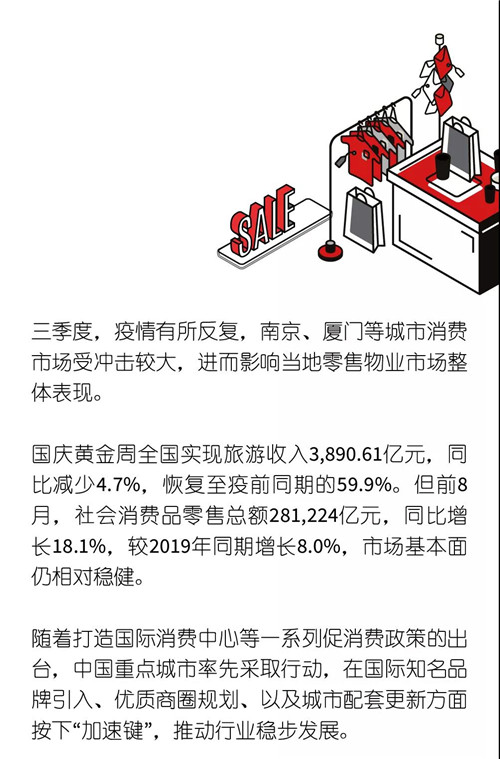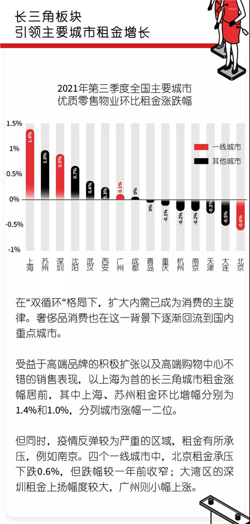 仲量聯(lián)行近日發(fā)布2021年第三季度全國(guó)房地產(chǎn)市場(chǎng)概覽,對(duì)全國(guó)房地產(chǎn)市場(chǎng)進(jìn)行回顧展望。在零售地產(chǎn)方面,三季度Z時(shí)代引領(lǐng)零售變革,消費(fèi)場(chǎng)景更多新奇零售組合;長(zhǎng)三角板塊引領(lǐng)商業(yè)租金增長(zhǎng);新增項(xiàng)目不斷,零售商業(yè)將迎戰(zhàn)年末消費(fèi)高峰。