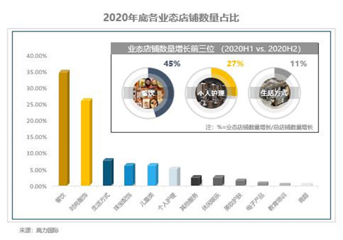 從業(yè)態(tài)來(lái)看,2020年下半年,餐飲,個(gè)人護(hù)理和生活方式的需求增長(zhǎng)明顯。截止2020年底,餐飲業(yè)態(tài)半年環(huán)比增加200多個(gè)店鋪,占比為36%,其需求上漲對(duì)整體市場(chǎng)的回暖起到重要影響。餐飲類(lèi)品牌尤其是快餐、休閑餐飲 (如:7分甜,Tims,松鶴樓和湊湊)和潮流運(yùn)動(dòng)類(lèi)品牌(如:adidas,MLB和FILA)回暖速度較快。