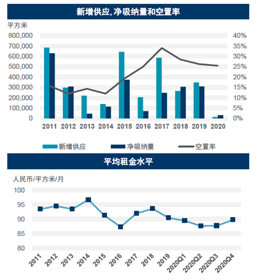2020年第四季度,西安甲級(jí)寫(xiě)字樓市場(chǎng)無(wú)新項(xiàng)目入市,全市甲級(jí)寫(xiě)字樓總存量為275.7萬(wàn)平方米。本季度,西安寫(xiě)字樓租賃市場(chǎng)延續(xù)了三季度的良好態(tài)勢(shì),季度凈吸納量達(dá)28,162平方米,在無(wú)新增供應(yīng)的情況下,整體市場(chǎng)空置率繼續(xù)環(huán)比下降1.0個(gè)百分點(diǎn)至25.5%。全市甲級(jí)寫(xiě)字樓平均租金繼續(xù)環(huán)比上升2.3%至每月每平方米人民幣89.7元。