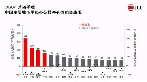 四個一線城市中,北京、上海和深圳都有超過7%的租金降幅。在北京,截至2020年底,租金創(chuàng)下連續(xù)八個季度下跌的紀錄。在上海,市場分化日益明顯,持續(xù)的新增供應(yīng)使業(yè)主在洽談租約條件上變得更加靈活并愿意提供更多優(yōu)惠條件,而前灘等部分租賃勢頭強勁的板塊,在2020下半年已開始實現(xiàn)租金增長。在廣州,甲級辦公樓租金在上半年因疫情對經(jīng)濟的沖擊而降幅明顯,但下半年租金跌幅較上半年有所收窄,同比跌幅仍為四個一線城市最小。