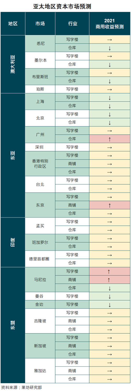 鑒于其市場深度,相對透明度以及進(jìn)一步壓制利率上限所帶來的上行潛力,澳大利亞是資本在該區(qū)域內(nèi)尋求“避風(fēng)港”行為的主要受益者之一。我們認(rèn)為,憑借澳大利亞強(qiáng)勁的經(jīng)濟(jì)復(fù)蘇前景和長期增長潛力,悉尼和墨爾本市中心和城郊商業(yè)區(qū)內(nèi)的寫字樓資產(chǎn)將繼續(xù)受到投資者的熱烈追捧。此外,考慮到2020年期間亞太地區(qū)投資者對澳大利亞資產(chǎn)的偏好,以及對某些行業(yè)收益率基本保持穩(wěn)定或收縮的預(yù)期,我們認(rèn)為這一趨勢可能延續(xù)到2021年。