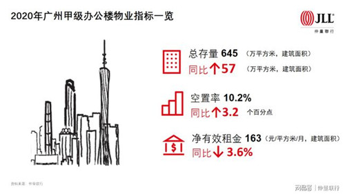 江婧麗預計2021年將是供應大年,新增辦公面積將接近為今年的兩倍,全年約140萬平方米甲級辦公空間投入廣州市場,其中近6成新增辦公空間將來自于琶洲。除了一些總部自用項目,琶洲短期放量供應將令其租賃市場壓力激增,供求不平衡將迫使該區(qū)域空置率上升,并加劇新項目對租戶的爭奪。