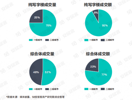 據(jù)58同城、安居客《2020年全國(guó)寫(xiě)字樓大宗交易盤(pán)點(diǎn)》報(bào)告顯示,從城市等級(jí)來(lái)看,純寫(xiě)字樓項(xiàng)目成交涉及16座城市,除北上廣深外,其余均為二線城市。其中一線城市成交量51宗,占比75%;成交額849億,占比92%。綜合體項(xiàng)目成交涉及12座城市,同樣均位于一線及強(qiáng)二線城市。其中一線城市成交12宗,占比52%;成交額254億元,占比77%。