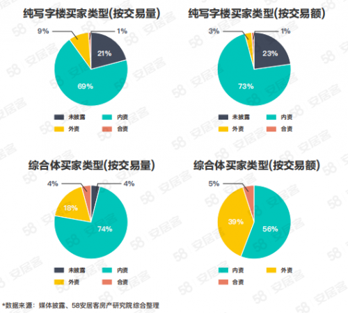 按交易額計(jì),純寫(xiě)字樓交易中內(nèi)資貢獻(xiàn)669億,占比73%,外資貢獻(xiàn)287億,占比3%;綜合體交易中內(nèi)資貢獻(xiàn)185億,占比56%,外資貢獻(xiàn)131億,占比39%。