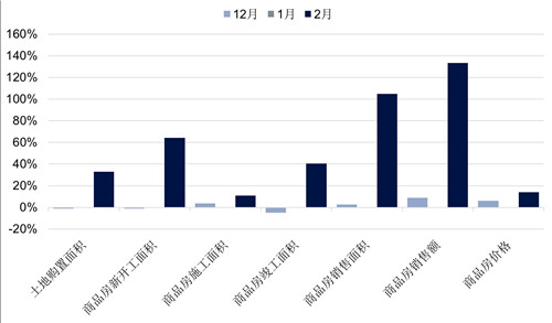 2021年初兩個(gè)月的數(shù)據(jù)與去年同期相比有較大起色,與此前預(yù)期一致。除土地銷售價(jià)格外,其他指標(biāo)均錄得兩位數(shù)增幅。