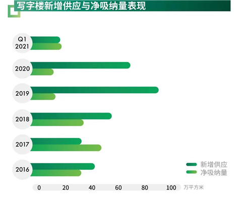 2021年第一季度,位于奧體、石景山和西直門(mén)區(qū)域的三個(gè)新項(xiàng)目交付使用,為寫(xiě)字樓市場(chǎng)帶來(lái)共計(jì)15.3萬(wàn)平方米的租賃面積。