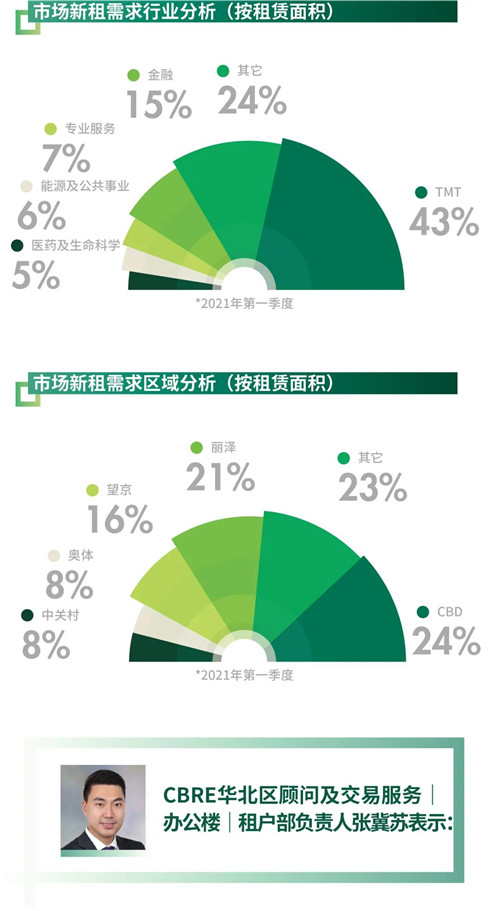 本季度,TMT、金融、專業(yè)服務(wù)這三大行業(yè)繼續(xù)位居寫(xiě)字樓新租需求的前三甲。其中TMT新租需求占比高達(dá)43%,集中表現(xiàn)在新媒體、在線教育和終端應(yīng)用等頭部企業(yè)的擴(kuò)租需求;專業(yè)服務(wù)業(yè)中律所升級(jí)和換新活躍;金融的基金、保險(xiǎn)板塊繼續(xù)發(fā)力,擴(kuò)租和搬遷需求多落位于核心中央商務(wù)區(qū),而金融科技和資產(chǎn)管理企業(yè)的擴(kuò)租需求也有所增加。此外,醫(yī)藥及生命科學(xué)、能源等行業(yè)同時(shí)錄有升級(jí)搬遷和新進(jìn)入北京市場(chǎng)設(shè)立辦公室的租賃交易。