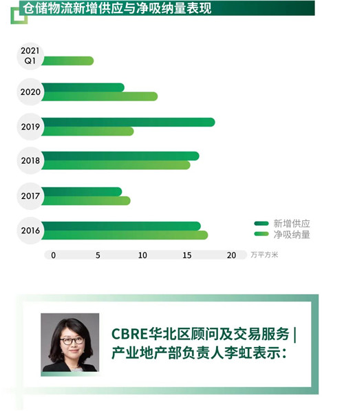 “年初發(fā)布的‘十四五’規(guī)劃提出支持具備條件的物流園區(qū)和重點(diǎn)企業(yè)引入鐵路專用線,支持利用工業(yè)廠房改造建設(shè)冷鏈物流基礎(chǔ)設(shè)施,發(fā)展智能立體倉(cāng)等;而以航空科技、航空物流等產(chǎn)業(yè)和國(guó)家物流樞紐、智慧物流示范區(qū)為定位的大興機(jī)場(chǎng)臨空經(jīng)濟(jì)區(qū)周邊的物流規(guī)劃也將在近期出臺(tái),這些舉措將為大北京物流地產(chǎn)發(fā)展注入活力。”