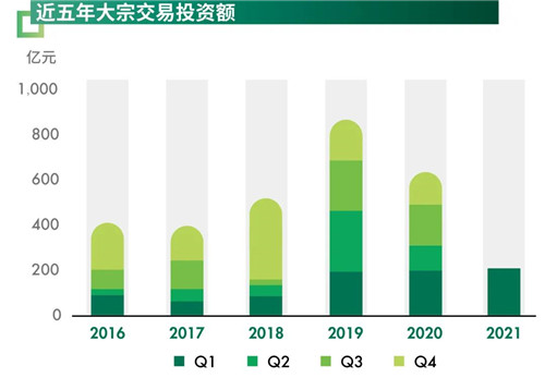 2021年第一季度,北京共達(dá)成十筆大宗交易,交易總額達(dá)209.1億元,環(huán)比和同比分別上漲40.0%和3.8%,交易活躍度進(jìn)一步提升,并成為本季度全國(guó)交易額最高的市場(chǎng)。